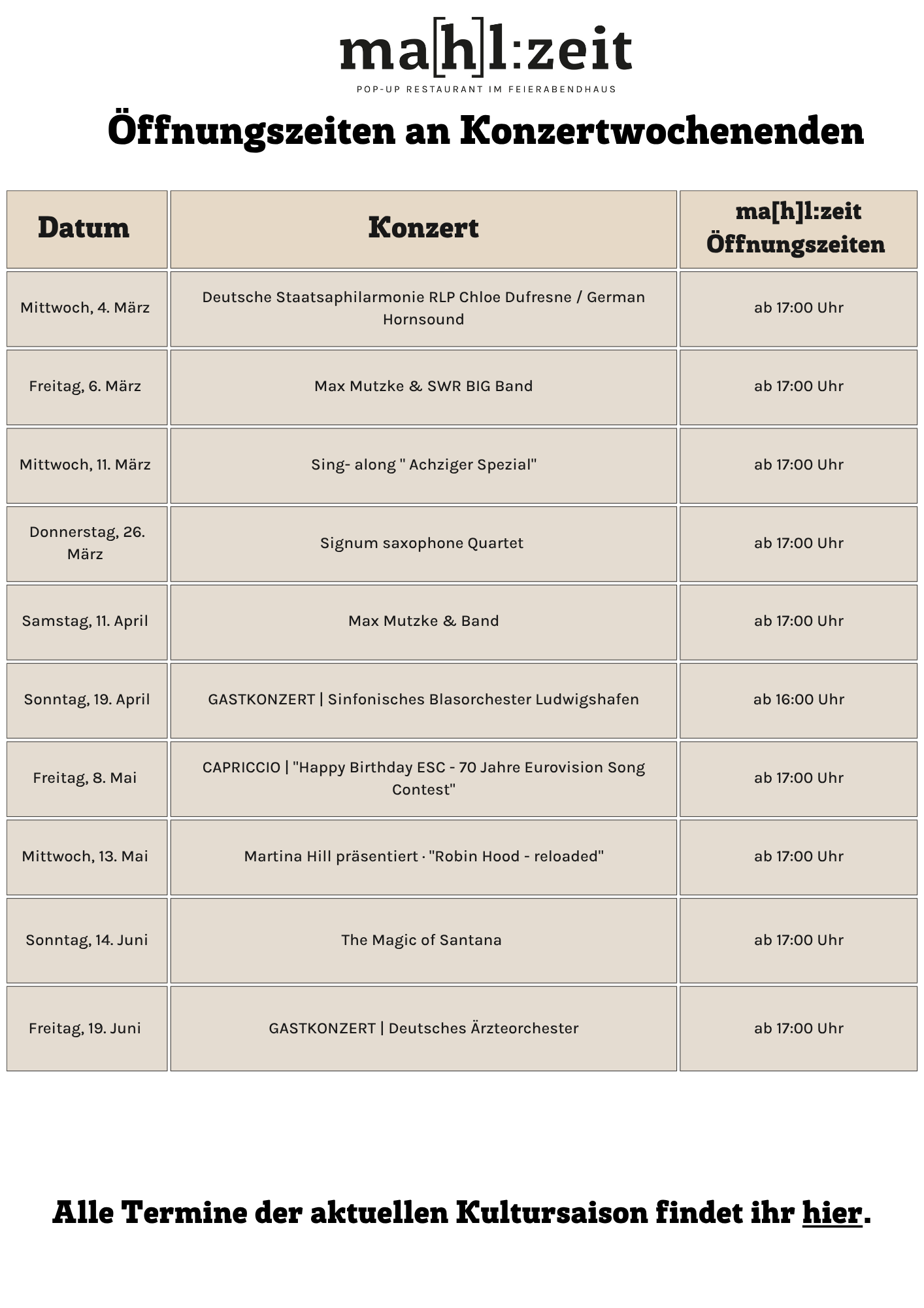 Öffnungszeiten an Konzertabenden